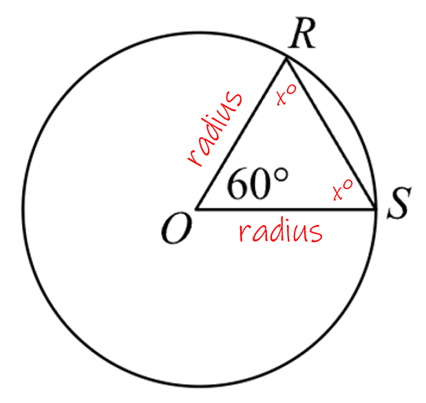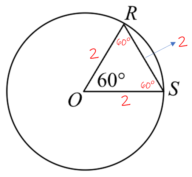 Solving the equation, we see that xx is equal to 6060 and triangle ROSROS is equilateral. The given information tells us that the perimeter of ROSROS is 66, so we can conclude the radius is 22 (see diagram below).